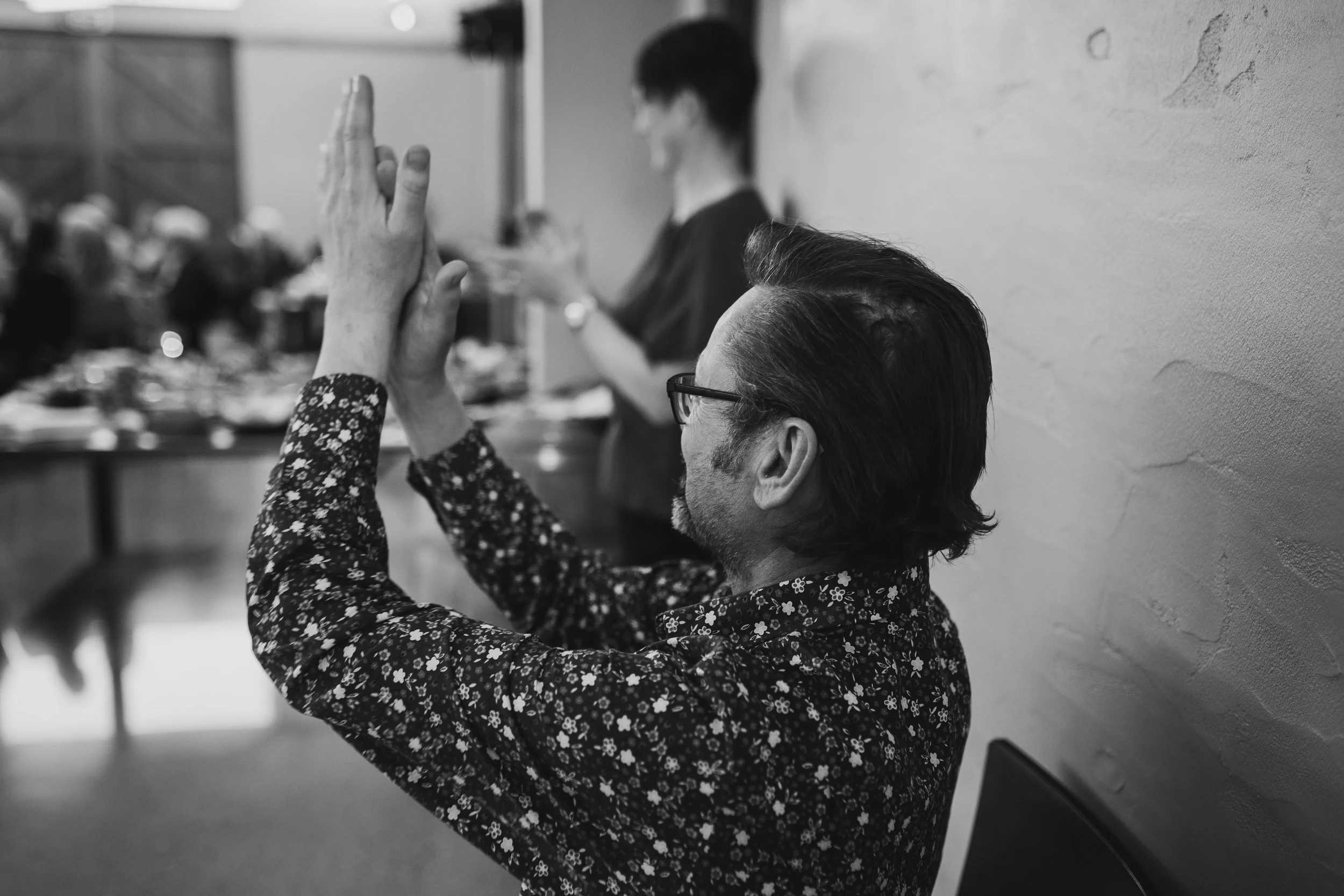 Composer Gareth Farr applauds the performance of one of his Postcards from the Lakes at the Cloudy Bay Shed in Cromwell