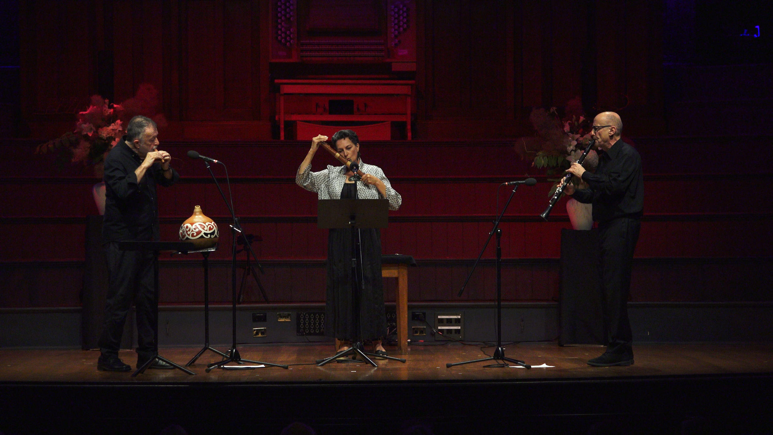 Bob Bickerton (left) and Ariana Tikao (taonga pūoro) with James Campbell (clarinet)