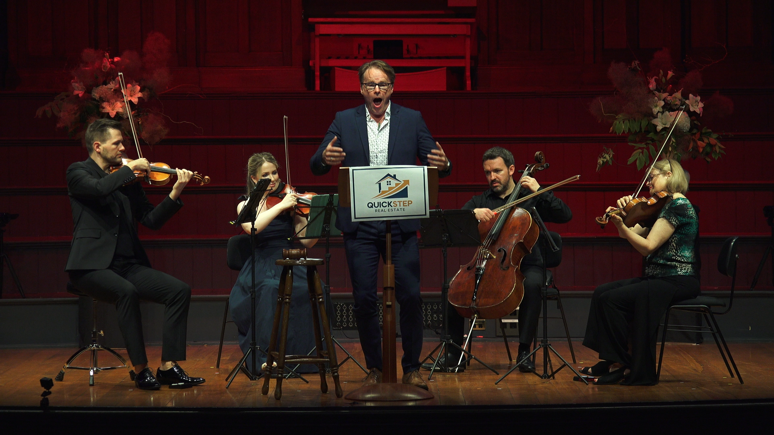 The comedic highlight of the Festival was the world premiere of composer Janet Jennings’ monodrama The Auctioneer, commissioned for the event. A hilarious work, it was written with the theatrical talents of Ainsworth in mind. Accompanied by the NZSQ, the tenor approached the stage down the aisle, greeting audience members en route, before introducing himself as “Melvin from Quick Step Real Estate”. Jennings wrote the libretto, laden with real estate cliché, at first about Melvin’s dreams – “a home for discerning buyers”, “resonating with elements of Feng Shui principles”, “sought after suburb”, “black granite benches, chef’s delight”, rising to a climax for “seamless indoor-outdoor floooow!” – which had the audience roaring with delighted recognition. The wit also extended to musical references, hints of other settings of New Zealand poetry and flavours of Baroque aria, scope for Ainsworth to show off his operatic tenor style.