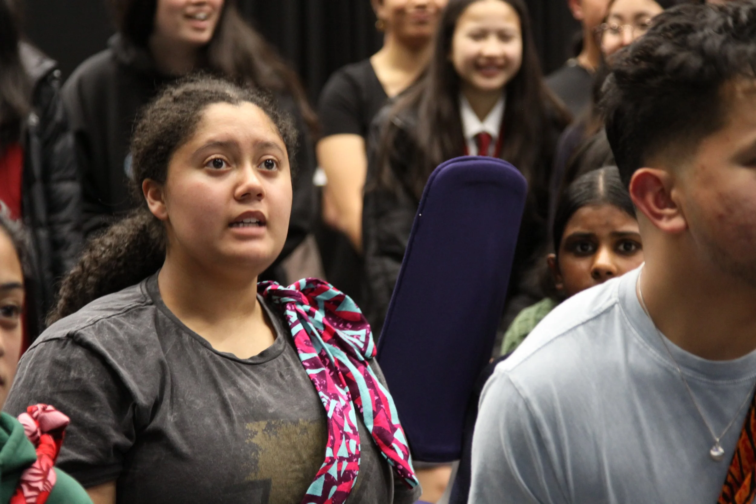 Chorus member Tara Randall and other young singers rehearsing at a weekend wananga for The Monster in the Maze